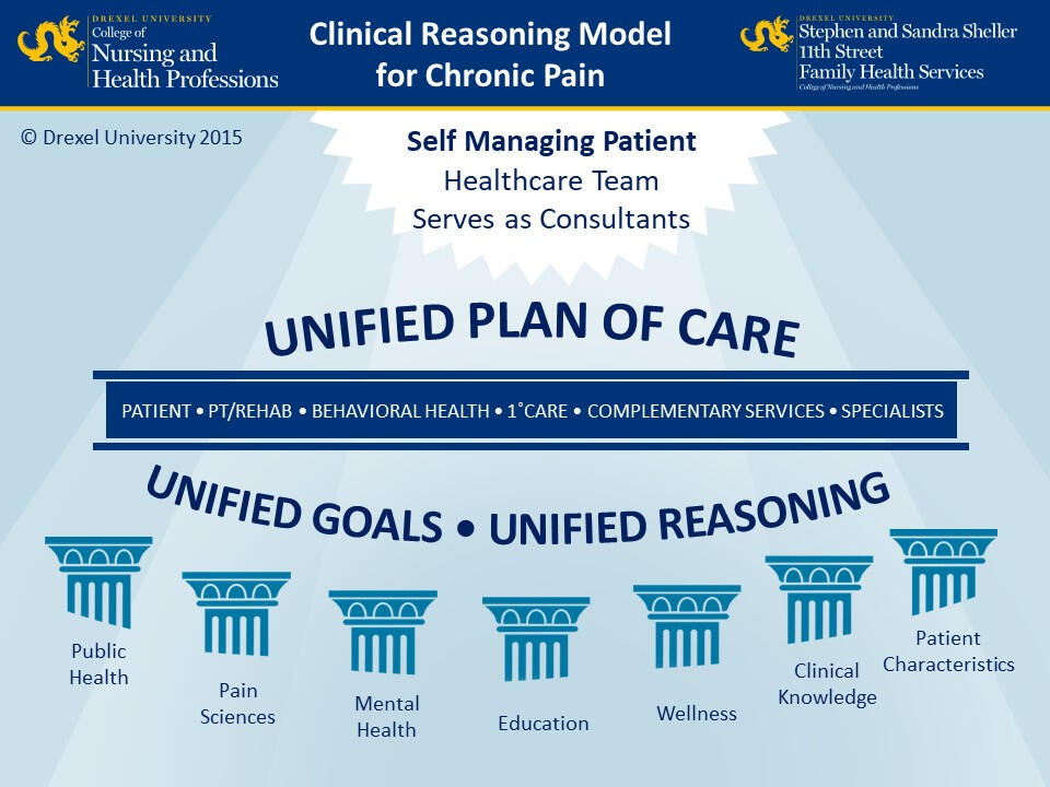 The top of the diagram represents the goal of treatment: people who are using supportive healthcare services as they self-manage their pain with little or no opioid use. To reach this goal, people in pain need education, mentorship for behavioral change, support addressing cognitive, affective, and social factors, and an understanding of the roles various healthcare providers serve in their health and wellness.The middle of the diagram depicts an interprofessional team that includes the person in pain. All members of the interprofessional team collaborate to arrive at unified goals and a unified plan of care. This differs from a multidisciplinary approach where people in pain see different professionals who are not functioning as a cohesive team, each providing different goals and treatment plans leaving the person in pain to sort through an often overwhelming amount of information and action items. Good communication among professionals, the person in pain, their family, and other people involved is essential in forming the collaboration needed for efficient and effective care.Each pillar at the bottom of the model represents a different area of research important for chronic pain management. While each team member specializes in their discipline, including the person in pain as an expert on themself and their pain experience, everyone should have broad knowledge of all areas so that they can effectively situate their expertise within the fabric of a holistic treatment approach that will prepare people in pain for a resilient path forward.